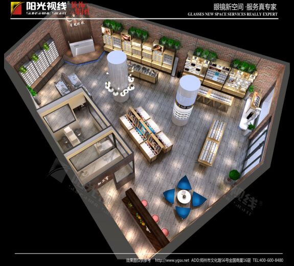 ▲還是先奉出了全視角的店面布局圖,圖中設(shè)計(jì)師對(duì)整個(gè)空間的把握非常精細(xì),各個(gè)區(qū)域銜接巧妙,各有特色,而整體卻又渾然天成的融為一體,這就是陽光視線資深的設(shè)計(jì)師對(duì)眼鏡店裝飾行業(yè)專注的結(jié)果了~