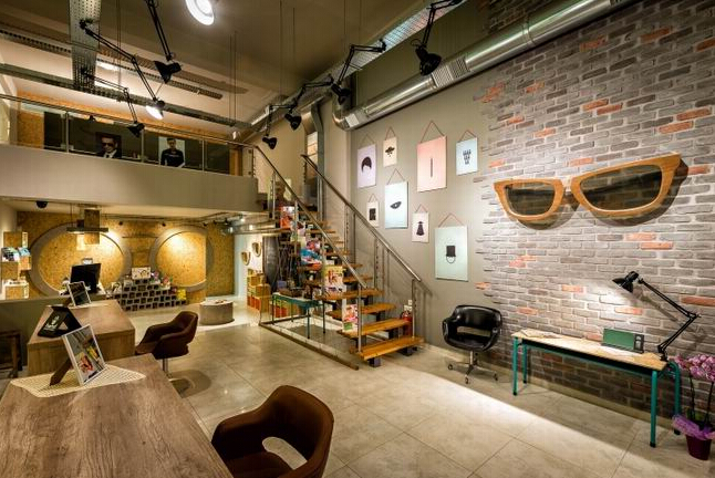 室內(nèi)的兒童區(qū)也加上了黑板,整個(gè)空間的裝飾元素大多都以眼鏡的造型而設(shè)計(jì),是不是感覺(jué)這樣的眼鏡店很獨(dú)特呢?